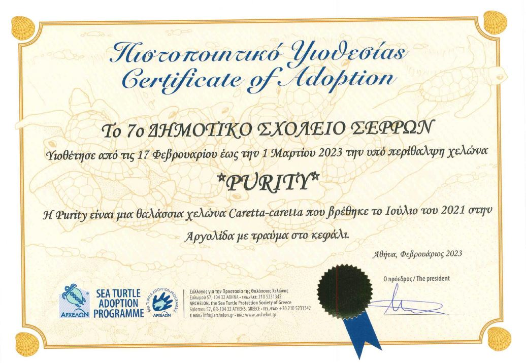 «Με τις ζωντανές διαδικτυακές ξεναγήσεις στο Κέντρο Διάσωσης Θαλάσσιων Χελωνών “ανοίγονται οι πόρτες του” στους μαθητές ολόκληρης της χώρας!». Σκοπός είναι να ευαισθητοποιήσει τους μαθητές σχετικά με τις απειλές που αντιμετωπίζουν οι θαλάσσιες χελώνες, αλλά και να τους εμψυχώσει ώστε να συμμετέχουν ενεργά στην προστασία του περιβάλλοντος. Μέσα από αυτή την ζωντανή εικονική περιήγηση, οι μαθητές είχαν την ευκαιρία να παρατηρήσουν τις θαλάσσιες χελώνες που περιθάλπονται στο Κέντρο Διάσωσης, να μάθουν τις ιστορίες τους και να λύσουν τις απορίες τους γι’ αυτές μέσα από οργανωμένη συζήτηση. Μετά την διαδικτυακή τους γνωριμία με τις χελώνες του Κέντρου Διάσωσης, οι μαθητές των τάξεων ,αποφάσισαν να υιοθετήσουν μία από αυτές, καλύπτοντας τα έξοδα νοσηλείας της για μερικές ημέρες. Έγιναν έτσι μικροί εθελοντές και με την προσφορά τους βοήθησαν στη διάσωση της θαλάσσιας χελώνας “ Purity”. Μετά την «υιοθεσία» το Κέντρο Διάσωσης μας έστειλε το «λούτρινο χελωνάκι» του ΑΡΧΕΛΩΝ, το πιστοποιητικό υιοθεσίας, καθώς και πληροφορίες για την υιοθετημένη χελώνα.